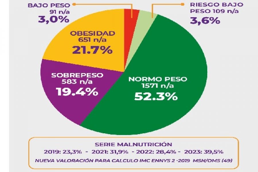 Los datos relevados, según el Índice de Masa Corporal y la edad, 1325 niños, niñas y adolescentes presentaron rasgos de malnutrición. Los casos tomados fueron desde los dos hasta los diecisiete años. Esto equivale a que un 44,1% de los encuestados presentaron malnutrición.