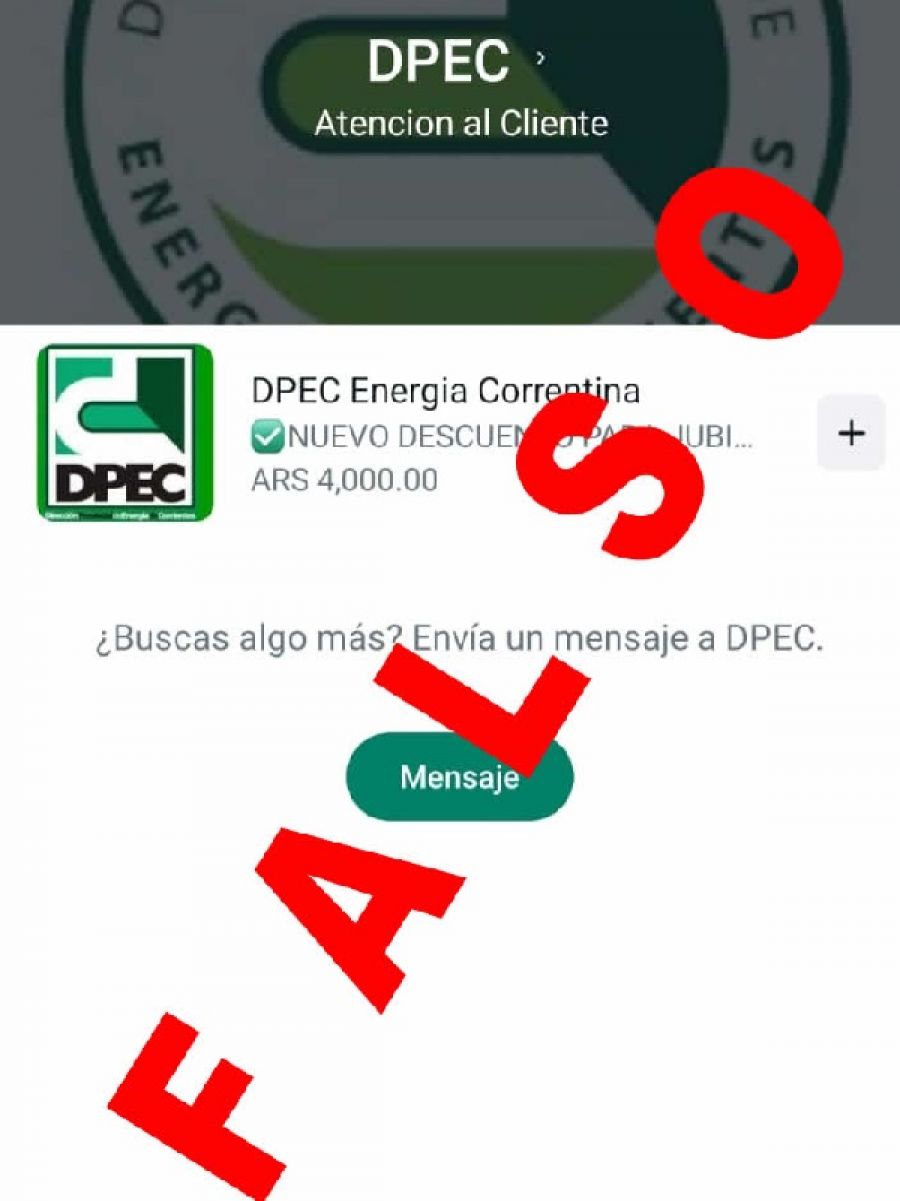 La Dirección Provincial de Energía de Corrientes informa la falsedad de una propuesta de descuento para jubilados que circula por medio de WhatsApp.
