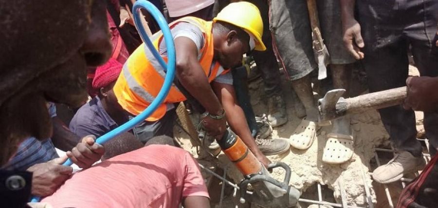 Los socorristas usaban herramientas eléctricas para rescatar a las personas atrapadas en los escombros.Imagen: NEMA Nigeria/X