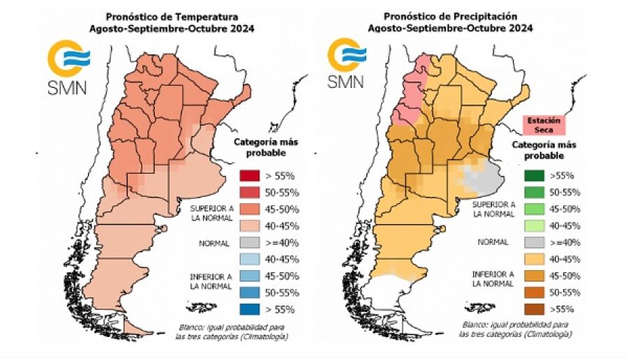 Ambas condiciones, que lógicamente configuran una situación de probable estrés para los cultivos, están contempladas en el último pronóstico climático trimestral del Servicio Meteorológico Nacional (SMN), que prevé las condiciones que se darán en el período comprendido entre agosto y octubre.