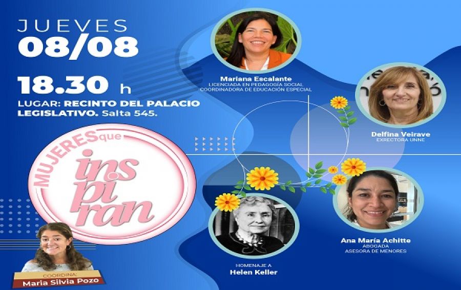 Este jueves 8 de agosto a las 18,30 hs. se realizará en el Recinto de sesiones de la Legislatura provincial, un conversatorio de tres destacadas mujeres, en el marco del ciclo “Mujeres que inspiran”, que impulsa el vicegobernador Pedro Braillard Poccard.