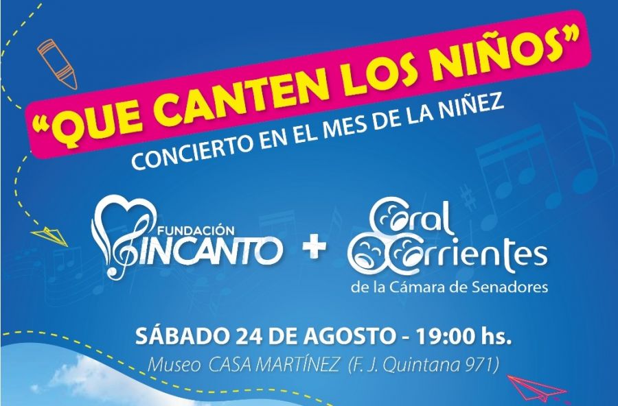 La Fundación Incanto y el elenco estable de la Cámara de Senadores de la provincia, el Coral Corrientes, brindarán un concierto para niños y niñas de instituciones de acogida y merenderos de Corrientes denominado “Que canten los niños”.