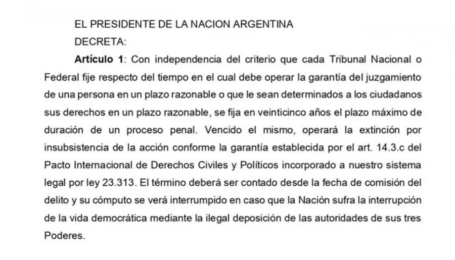 "Con independencia del criterio que cada Tribunal Nacional o Federal fije respecto del tiempo en el cual debe operar la garantía del juzgamiento de una persona en un plazo razonable o que le sean determinados a los ciudadanos sus derechos en un plazo razonable, se fija en veinticinco años el plazo máximo de duración de un proceso penal", señala el primer artículo.