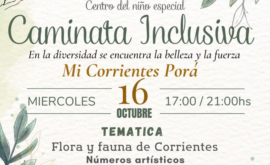 Este miércoles se realizará la Caminata Inclusiva en el Paseo Aráztay y el Anfiteatro José Hernández, en la costanera de Corrientes. La jornada se desarrollará desde las 17:00 hasta las 21:00 horas, con un aviso de inicio 15 minutos antes del evento.