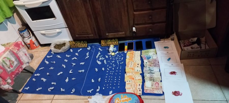 En el domicilio, los agentes encontraron una bolsa con sustancias de origen vegetal picada y cogollos, junto con 47 envoltorios de la misma sustancia y 62 envoltorios adicionales de una sustancia blanquecina.