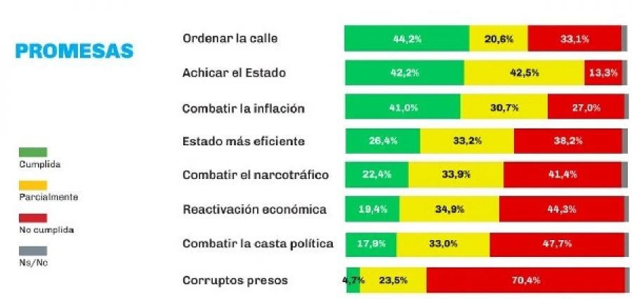 Pero aún así las mayores imágenes negativas que surgen de que no estén presos los corruptos y que no haya sido combatida la casta política superan a los aciertos que se le reconocen en cuanto a la vía pública, a la motosierra y a la lucha contra el alza de los precios.