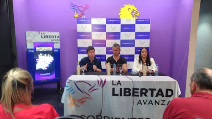 El vicepresidente nacional de LLA , y presidente de Diputados Martin Menem junto sl diputado nacional por Corrientes, Lisandro Almirón y Laura Oderda Marcoré, presidente del partido a nivel provincial dieron una conferencia de prensa en Corrientes.