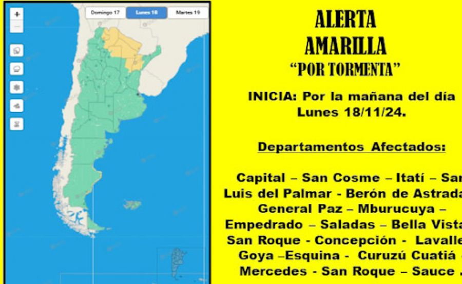 El Comando Operativo de Emergencias (COE), dependiente del Ministerio de Seguridad de Corrientes, emitió un alerta amarilla por tormentas, para la mañana de este lunes , en base a datos proporcionados por el Servicio Metereológico Nacional.