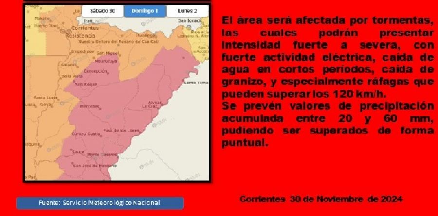 Asimismo, se espera para este 1 de diciembre un alarma naranja para los departamentos Capital, San Cosme, Itatí, San Luis del Palmar, General Paz, Berón de Astrada, San Miguel, Ituzaingó, Empedrado, Saladas, Mburucuyá, Bella Vista, Lavalle, Goya y Esquina