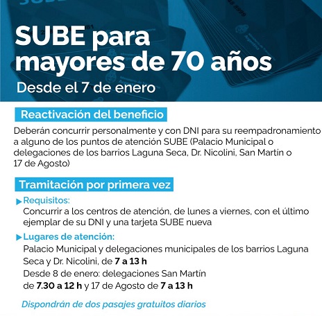 La Municipalidad dispuso centros de atención con personal capacitado para evacuar las dudas de las personas mayores de 70 años. A partir del 7 de enero, funcionarán en días hábiles, de lunes a viernes, en el Palacio Municipal, de 7.15 a 12.50, y en las delegaciones de los barrios Laguna Seca, 17 de Agosto y Dr. Nicolini, de 7 a 13. En tanto que en la delegación San Martín, funcionará de 7,30 a 12.30.