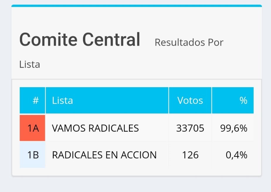 Radicales en Acción lista que dirige Ricardo Colombi que un día antes desistió de competir a nivel provincial y en 18 distritos intentó en vano que no se votara este domingo en los lugares donde había una sola lista.