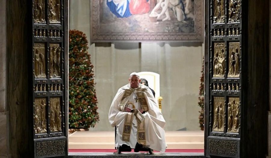El sumo pontífice arribó en silla de ruedas y afectado por un resfrío que le impidió celebrar al Ángelus el pasado domingo. "La Puerta Santa que se abre en la noche de Navidad es una invitación a realizar un paso, una Pascua de renovación, a entrar en esa vida nueva que nos ofrece el encuentro con Cristo", dijo Jorge Bergoglio.
