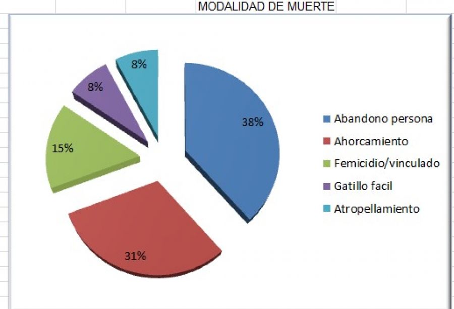 - Servicio Penitenciario: Tres muertes (23%) se produjeron en contextos de encierro, incluyendo un caso de autolesión y dos por abandono de persona debido a la falta de atención médica adecuada.