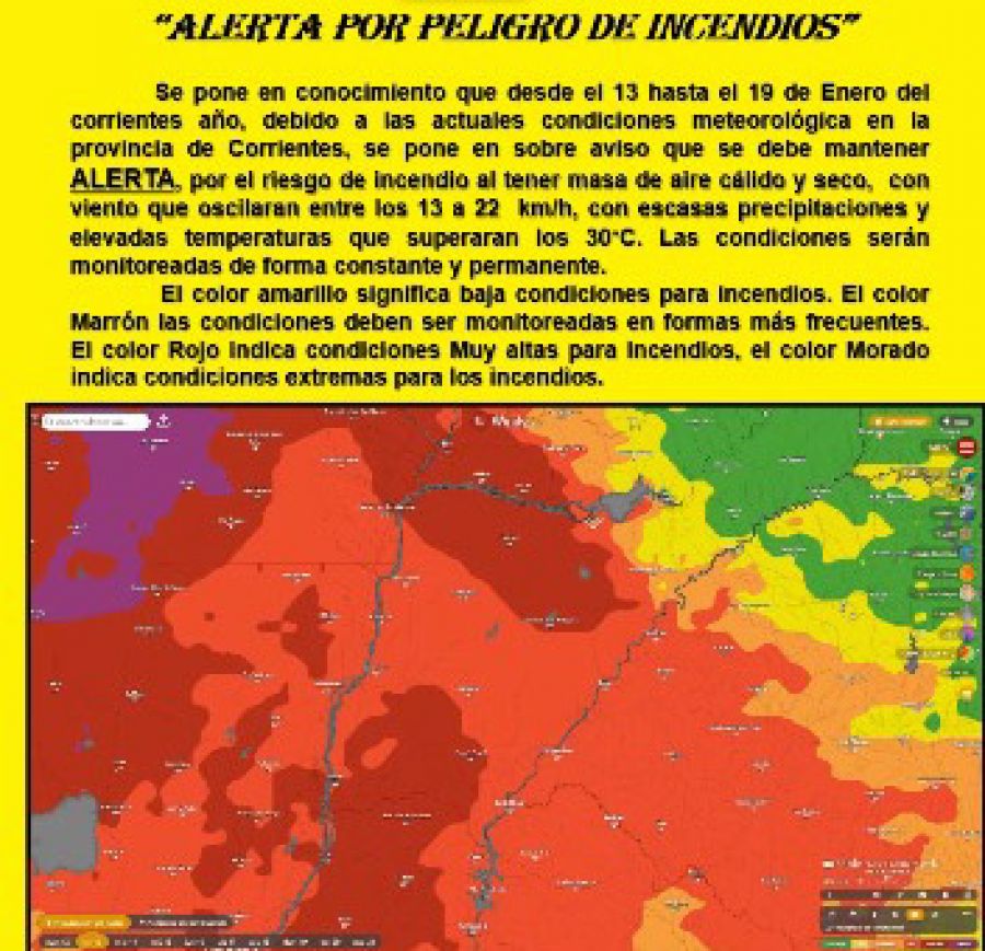 El Comando Operativo de Emergencias de Corrientes (COE) emitió este lunes una alerta por peligro de incendios para la presente semana debido a la escasez de lluvias y elevadas temperaturas.