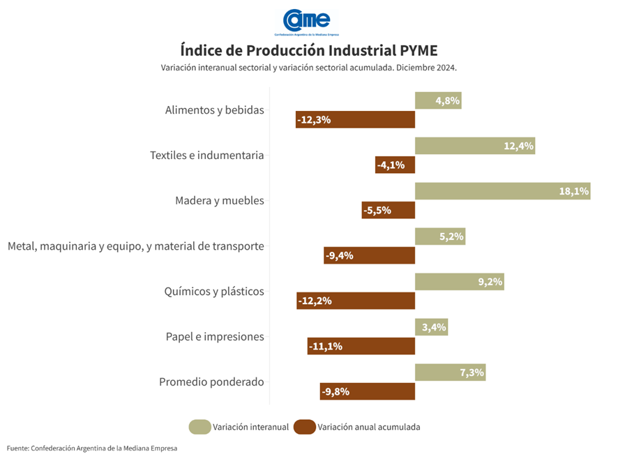 Un infome de Came indica que el sector cerró el 2024 con una caída acumulada del 9,8% respecto al 2023 aunque la actividad manufacturera creció 7,3% interanual en diciembre último