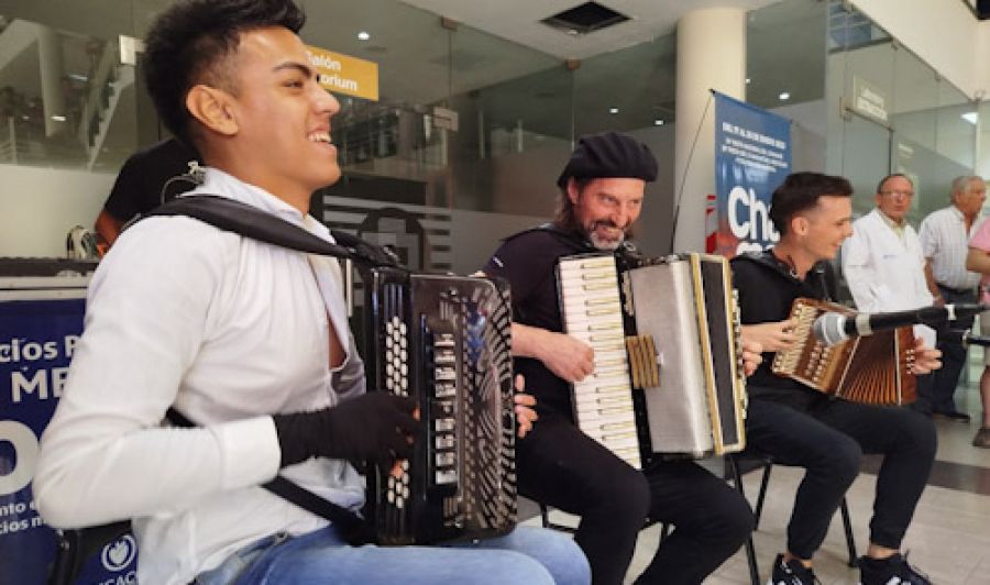 En la mañana del martes, el reconocido músico acompañado de los jóvenes acordeonistas, Emiliano López y Enzo De Martínez, deleitaron en en el acceso al cenro cardiológico