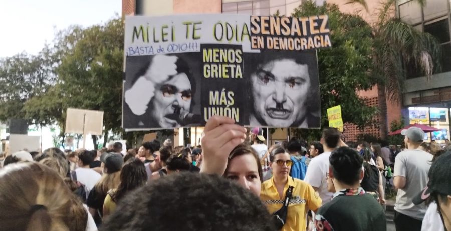 Prevalecieron consignas y carteles como " Democracia ,sí, derecha no", "Como a los nazis les va a pasar, a donde vayan los iremos a buscar", "Milei basura sos la dictadura" "Alerta alerta alerta antifascista" "Se cuidan los racistas américa latina va a ser toda Anti fascista," y "Argentina, Argentina"