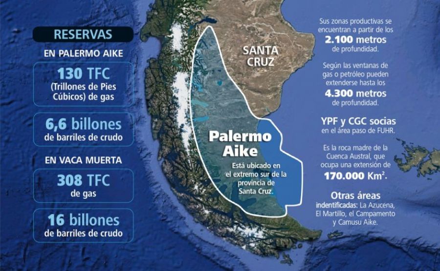 La provincia de Santa Cruz está a las puertas de una nueva etapa de su producción de hidrocarburos con el potencial intacto que representa la formación no convencional de Palermo Aike, largamente conocida como el "nuevo Vaca Muerta" que, desde la Cuenca Austral, empezó a dar los primeros resultados positivos de petróleo y gas a partir de los ensayos que vienen llevando adelante las empresas YPF y CGC, la Compañía General de Combustible del grupo América.