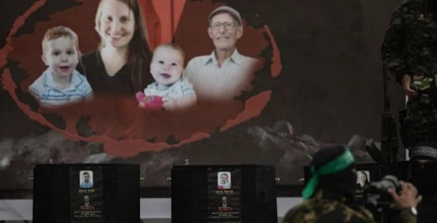 El citado medio señaló que los milicianos dispusieron sobre un escenario los ataúdes negros con los nombres de Shiri Bibas- Silberman, de origen argentino y peruano, secuestrada el 7 de octubre de 2023 con 32 años, y sus hijos, Ariel y Kfir Bibas, con 4 años y 9 meses respectivamente en ese momento, así como el de Oded Lifshitz, que tenía 83.