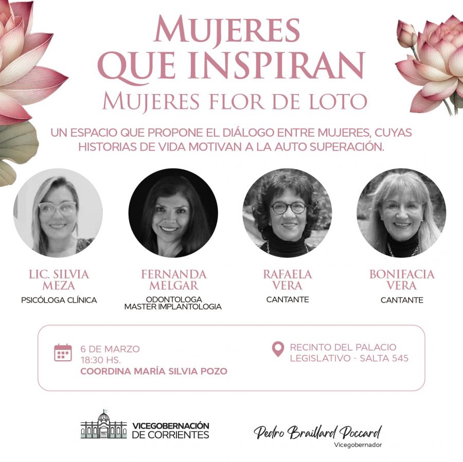 El Vicegobernador de la provincia de Corrientes, Dr. Pedro Braillard Poccard, invita al inicio del ciclo "Mujeres que inspiran. Mujeres flor de loto" 2025, un espacio concebido para visibilizar y reconocer el impacto de mujeres que, desde sus ámbitos de acción, han construido trayectorias significativas y ejemplares.