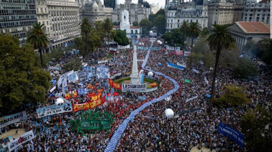 La movilización confluyó un acto central que se realiza frente a Casa Rosada donde se congregaron las columnas de agrupaciones de derechos humanos, sindicatos, partidos políticos y movimientos sociales bajo consignas contra el Gobierno y mensajes que reivindicaron la cifra de 30.000 desaparecidos cuestionada por la administración de Javier Milei.