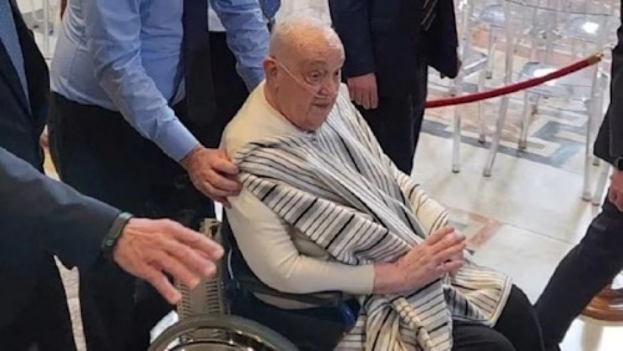Hacia las 13 llegó Francisco en silla de ruedas y con las cánulas nasales para el oxígeno a la basílica, donde encontró a un centenar de fieles muy emocionados. Pero lo que más llamó la atención fue su atuendo, pues llevaba una camiseta blanca, pantalones oscuros y un poncho, en una imagen muy diferente de la habitual con el hábito papal blanco.