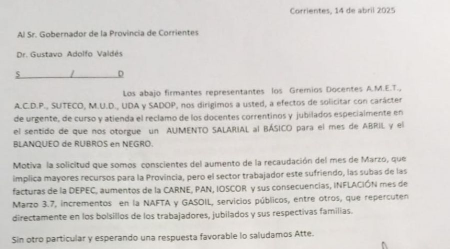 “Nos dirigimos a usted, a efectos de solicitar con carácter de urgente, que atienda el reclamo de los docentes correntinos activos y jubilados y que se otorgue un aumento al Salario Básico para el mes de Abril 2025 y el Blanqueo de los Rubros en Negro dentro del haber”, indica el documento firmado por Fernando Ramírez (SUTECO), José Gea (ACDP), Andrés Cristaldo (MUD), Diego Ayala (SADOP), Rufino Fernández (AMET) y la representante de UDA.