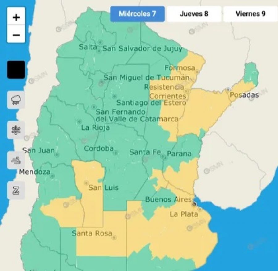 De esta manera, el SMN mantenía un alerta amarillo que rige este miércoles para zonas de Corrientes, Misiones, Chaco y Formosa.la provincia de Buenos Aires, incluido el AMBA; y de La Pampa, San Luis, Mendoza, Santa Fe, Entre Ríos, Corrientes, Misiones, Chaco y Formosa.