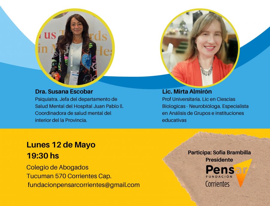 La charla será desarrollada el día lunes 12 de mayo, a las 19:30 hs. en el Colegio de Abogados, (Tucumán 570, Ciudad de Corrientes) y contara con la ponencia de profesionales destacadas, la Dra. Susana Escobar; reconocida psiquiatra, quien abordará los principales indicadores de riesgo psicoemocionales en niños y adolescentes, así como estrategias prácticas para su abordaje desde el ámbito escolar. También acompañará la disertación la Lic. Mirta Almirón; licenciada en Ciencias Biológicas, neurobióloga, psiconeuroeducadora, gestora educativa y comunicadora digital, quien compartirá una mirada innovadora sobre la relación entre neurociencia, educación y bienestar emocional, remarcando la importancia de promover entornos educativos emocionalmente saludables.