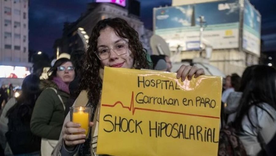 Los profesionales residentes del Hospital Garrahan se manifestaron hoy en el Obelisco en el marco del plan de lucha por salarios dignos y mejores condiciones laborales, a la espera de un ofrecimiento formal de parte del Ministerio de Salud, más allá del trascendido de un bono no remunerativo para llegar a un salario de 1.300.000 pesos.