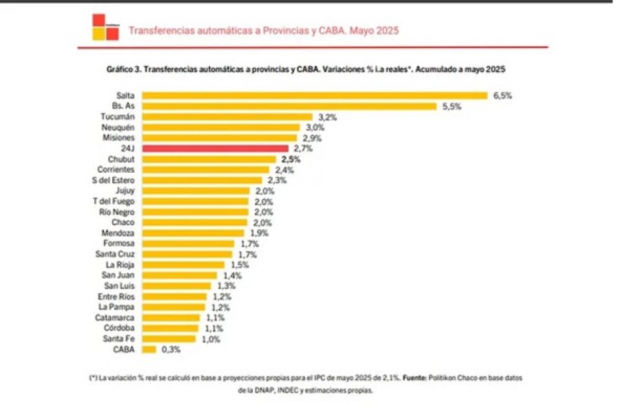 Por jurisdicciones, Salta muestra la mayor expansión acumulada con +6,5% y CABA la más leve con +0,3%, principalmente por el nulo impacto que hay en ese distrito de los conceptos por leyes especiales y compensación de consenso fiscal.