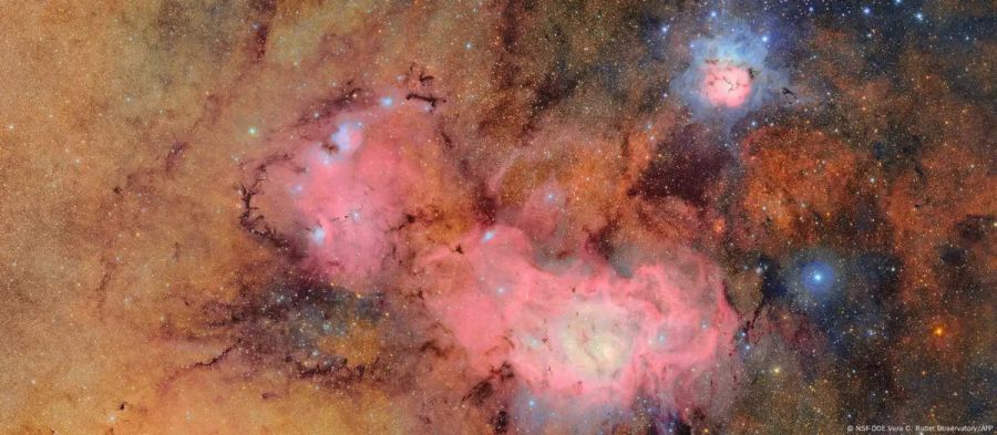 Una de las primeras imágenes es una composición de 678 exposiciones tomadas en solo siete horas, que captura la Nebulosa Trífida y la Nebulosa Laguna, ambas a varios miles de años luz de la Tierra, brillando en vivos tonos rosados sobre un fondo rojo anaranjado.