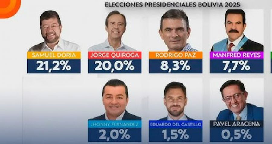 Los principales contendientes son el empresario Samuel Doria Medina (alianza Unidad), el expresidente Jorge "Tuto" Quiroga (Libre) y el presidente del Legislativo, Andrónico Rodríguez (Popular), este último como la figura de izquierda con más opciones según sondeos.