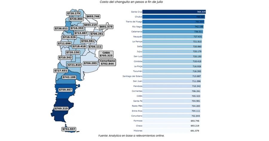 En el extremo opuesto, el nordeste argentino registra los valores más bajos: Formosa ($693.746), Chaco ($693.219) y Misiones ($691.579). La diferencia entre el ticket más alto y el más bajo supera los $77.000 en un mes.