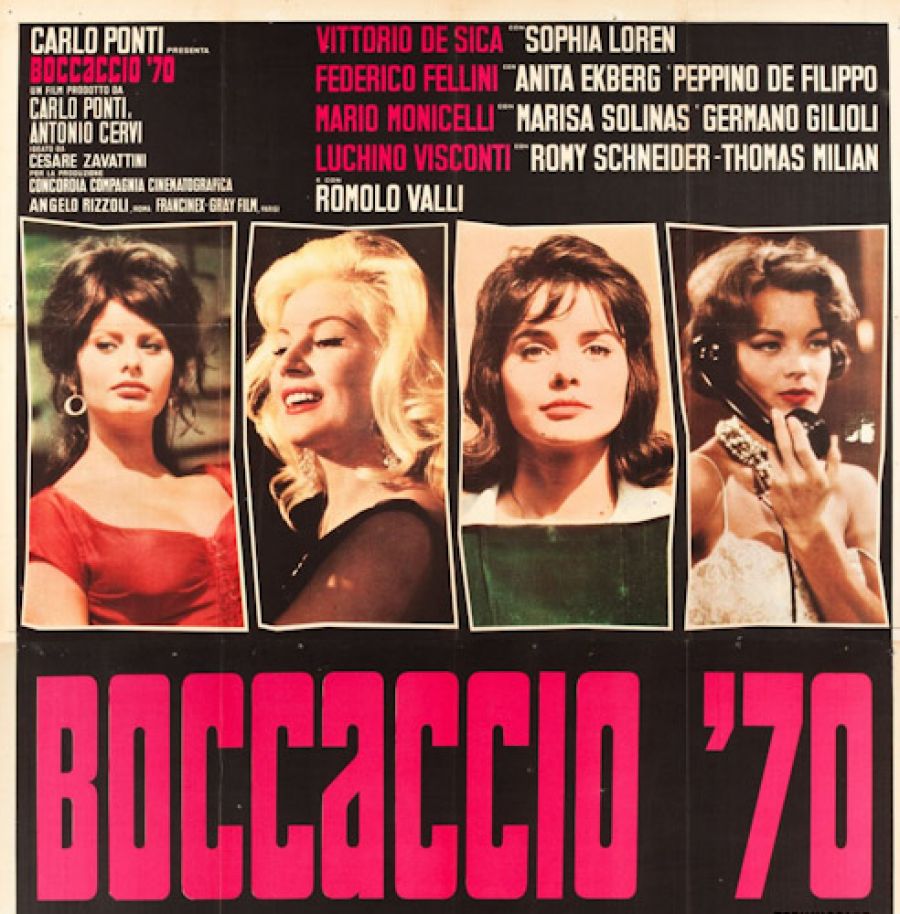 El lunes 1ero de septiembre a las 21 hs., se exhibirá, en CINE DEBATE ESPACIO MARIÑO, la PRIMERA PARTE del film italiano: “BOCACCIO 70”, dirigido por MARIO MONICELLI y FEDERICO FELLINI y protagonizada por ANITA EKBERG, PEPPINO DE FILIPPO, GERMANO GILIOLI y MARISA SOLINAS, comedia satírica y dramática inspirada en las obras de Bocaccio. Los episodios de esta primera parte son: “RENZO Y LUCIANA” (de MONICELLI) y “LAS TENTACIONES DEL DR. ANTONIO” (de FELLINI).