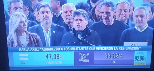 Desde La Plata habló luego el gobernador bonaerense Axel Kicillof artífice de la victoria. Tuvo especiales palabras de reconocimiento para la ex presidente Cristina Fernández . "Es un momento reparador, le hemos puesto freno al gobierno de Milei", señaló mientras cuestionó el "rumbo extravagante del gobierno nacional"