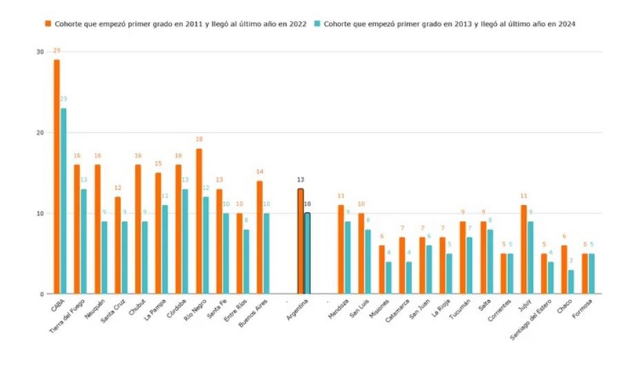 Además se observó que las brechas provinciales son notorias. Por un lado, la Ciudad de Buenos Aires encabeza con 23 de cada 100 estudiantes que terminan en tiempo y forma, seguida por Tierra del Fuego y Córdoba (13). En tanto, Chaco (3) y Santiago del Estero, Misiones y Catamarca (4) son los distritos con peores guarismos.