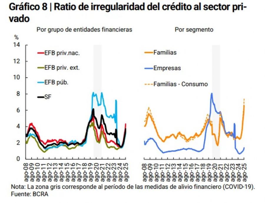 La morosidad en las familias subió por décimo mes consecutivo en agosto y alcanzó un 6,6% sobre el total de créditos, lo cual representó un nuevo récord, en al menos 15 años. Las elevadas tasas de interés y el poco dinamismo de los salarios reales impactaron en la capacidad de pago.