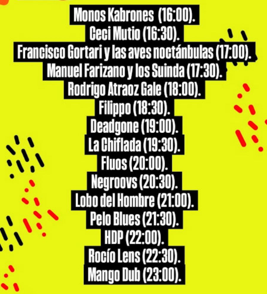 Según la programación, a las 16 horas comienza con la actuación de Monos Cabrones, seguido de Ceci Mutio, Francisco Gortari y las aves noctámbulas, Manuel Farizano y los Suinda, Rodrigo Atraoz Gale, y Filippo. Para las 19 está previsto que suba al escenario Deadgone, luego La Chiflada, Fluos, Negroovs, Lobo de Hombre, Pelo Blues, HDP, Rocío Lens, y a las 23 horas cerraría Mango Dub.