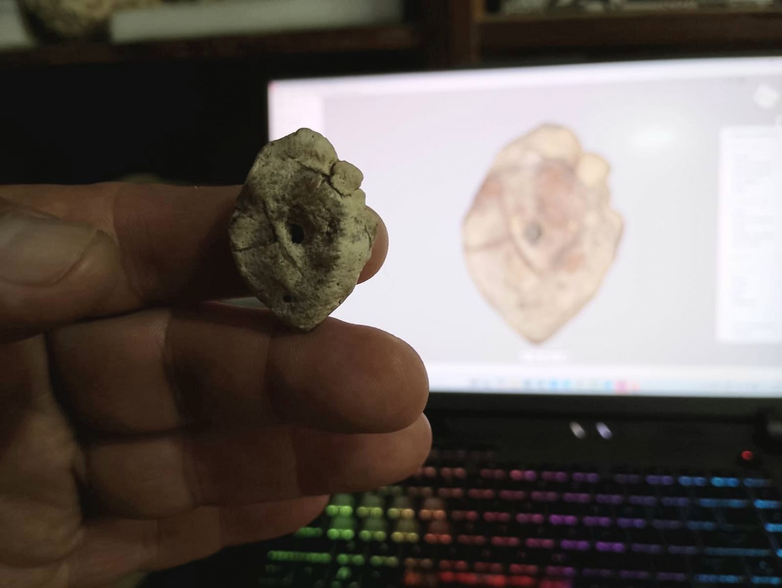 Durante los relevamientos, se colectaron diversos tipos de materiales, pero uno de ellos llamó la atención del Téc. Pedro Cuaranta, quien, con gran acierto, pudo observar que entre los clastos a la orilla de un pequeño arroyo donde aflora la formación Solari, de edad Cretácica, se encontraba un elemento que era diferente al resto del material presente en el sitio.