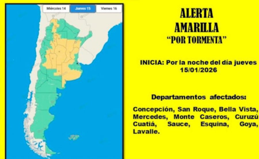 El alerta rige para Concepción del Yaguareté Corá, San Roque, Bella Vista, Mercedes, Monte Caseros, Curuzú Cuatiá, Sauce, Esquina, Goya y Lavalle.