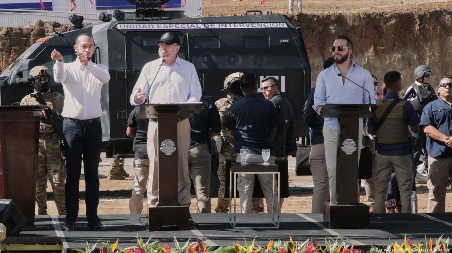 Los mandatariose dieron una rueda de prensa en el sitio donde se inició la construcción del Centro de Alta Contención de Crimen Organizado (CACCO), obra basada en el Centro de Confinamiento del Terrorismo (CECOT), la megacárcel salvadoreña para pandilleros y símbolo de la "guerra" contra estas bandas.