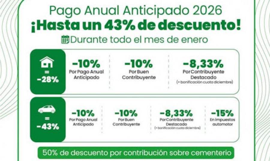 Desde el pasado 2 de enero están disponibles las liquidaciones para que los contribuyentes puedan adherirse al Pago Anual Anticipado 2026, que contempla importantes beneficios y descuentos en materia de impuestos, tasas, servicios y contribuciones.