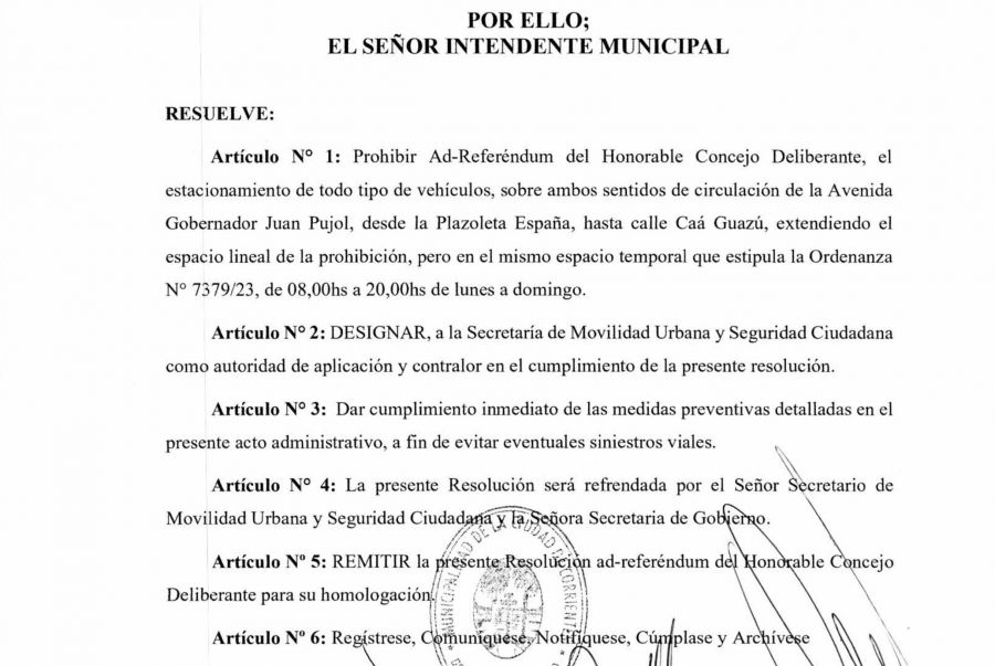 En consecuencia, el Artículo Nº 1 de la Resolución Nº 149 dispone “Prohibir, ad-referéndum del Honorable Concejo Deliberante, el estacionamiento de todo tipo de vehículos sobre ambos sentidos de circulación de la Avenida Gobernador Juan Pujol, desde la Plazoleta España hasta calle Caá Guazú, extendiendo el espacio lineal de la prohibición, en el mismo espacio temporal que estipula la Ordenanza Nº 7379/23, de 08:00 a 20:00 horas, de lunes a domingo”. La medida rige en ambos sentidos de circulación y amplía de manera significativa el tramo alcanzado por la restricción horaria.