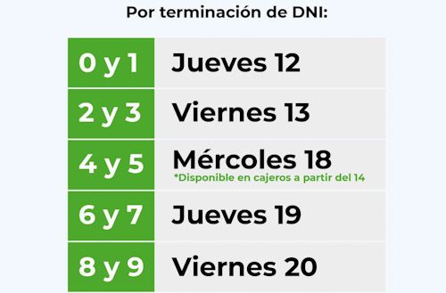 En este caso, el viernes 13 les corresponderá cobrar a los trabajadores cuyos DNI terminen en 0, 1 y 2; el miércoles 18 a DNI finalizados en 3, 4, 5 y 6; y concluirá el jueves 19 con el pago a los que tengan documentos que finalicen en 7, 8 y 9.