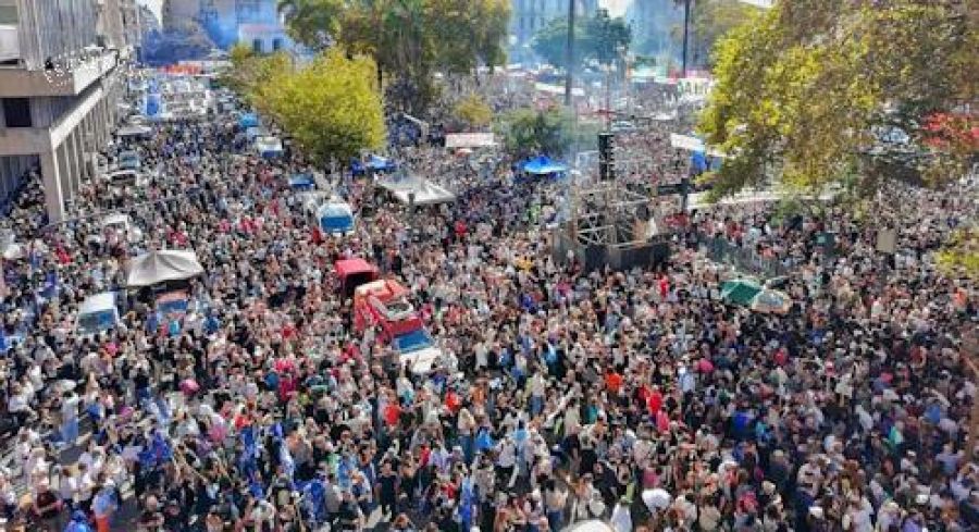 La frase despertó gritos de los manifestantes, con “Milei basura vos sos la dictadura” como consigna preponderante.