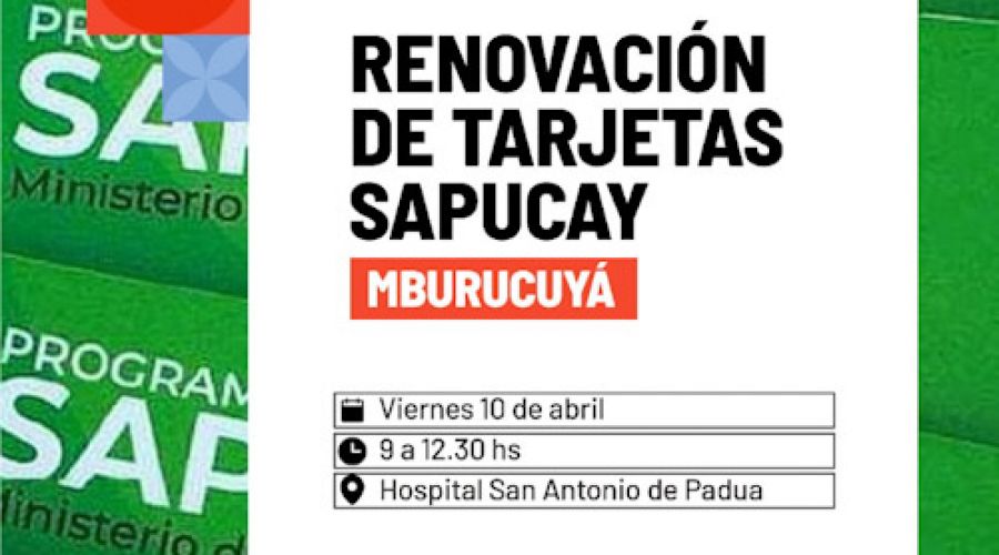 Este viernes 10 de abril de 9 a 12,30 hs, se llevará a cabo la renovación del plástico de las tarjetas Sapucay, a beneficiarios de la localidad de Mburucuyá que ya estén vencidas. Será en el predio del Hospital San Antonio de Padua.