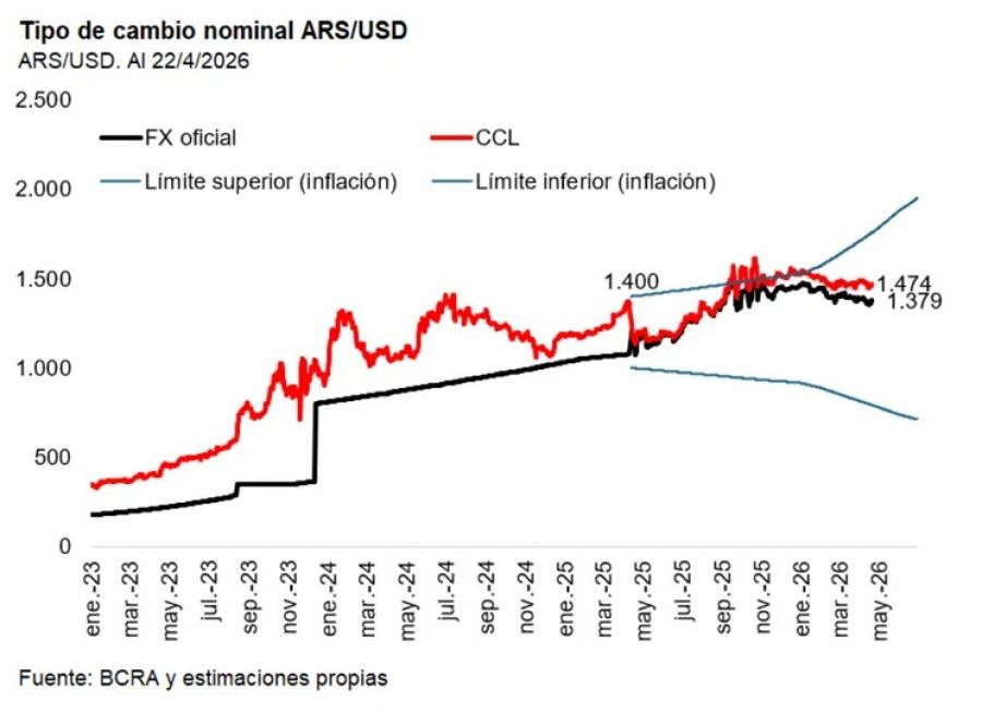 Quantum detalló que al 22 de abril el tipo de cambio oficial cerró en $1.379, mientras que el límite superior del esquema cambiario se ubicó en $1.758. Esto implicó una brecha de 27,5% entre ambos valores, diferencia que se amplió en paralelo a una mejora del frente externo y a una mayor disponibilidad de dólares en el mercado local.