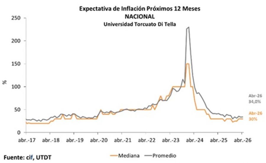 La inflación esperada a nivel nacional por la población, para los próximos treinta días, es de 3,93% según el promedio y 3% según la mediana, según publicó en esta jornada el Centro de Investigación de Finanzas de la Universidad Di Tella. Además, la inflación esperada a nivel nacional para los próximos doce meses se ubicó en 34% según el promedio y en 30% según la mediana.