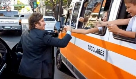 Rumbo a Olivos, Milei se bajó del auto para saludar a un micro escolar